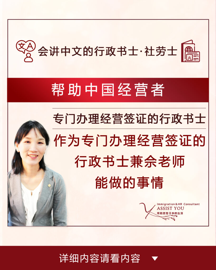 作为一名会讲中文的行政书士与社会保险劳务士,我致力于帮助在日本创业的中国经营者们,在法律与实务的两方面获得安心与稳定的生活。