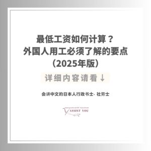 您好,我是日本行政书士·劳务士的大西祐子 2025年,预计日本全国最低工资将上调约60日元以上。对企业而言这意味着人件费上升;但更重要的是,不遵守最低工资=违法,将直接影响外国人雇用与在留资格的维持。本文用最简单的语言, […]