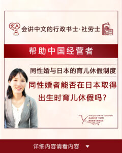 您好,我是日本行政书士·劳务士的大西祐子。 最近,有人咨询:「在母国已合法结婚的女性同性伴侣,在日本是否也能取得‘出生时育儿休假’?」 根据日本的制度,即使不是出产方的配偶,只要是在出产后56日以内,也可以取得 “出生时 […]